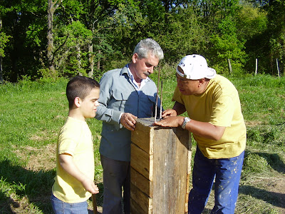 Gñima preparó el encofrado de las doce columnas que sustentan la base, cada una de ellas de diferente altura para que la base quede nivelada, Asun vigila los trabajos